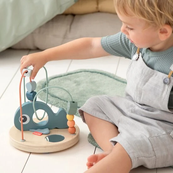 Le labyrinthe à perles Wally permettra à votre enfant d’exercer sa motricité fine en bougeant les petites perles et le poisson d’un côté à l’autre. La baleine et les autres éléments maritimes encourageront votre enfant à explorer le monde sous-marin. Les petits vont adorer pousser le poisson vers le haut ou le bas en suivant ses mouvements dans le petit miroir et le glisser à travers le ventre de Wally ! Les nageoires de la baleine sont dans un tissu doux crépitant. Le labyrinthe à perles Wally au tons bleus océan avec des éléments colorés est fabriqué en bois d’origine responsable et peint avec de la peinture à l’eau sans substances nocives pour que votre enfant puisse jouer en toute sécurité.