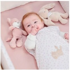 Doudou Rose, format mouchoir avec un jeu des matières entre le coton bio fleuri, le velours vieux rose et son joli petit minois en lin ornée d’une couronne de fleurs. Petit plus : il est doté d’un coin de dentition pour soulager bébé lors des poussées dentaires.