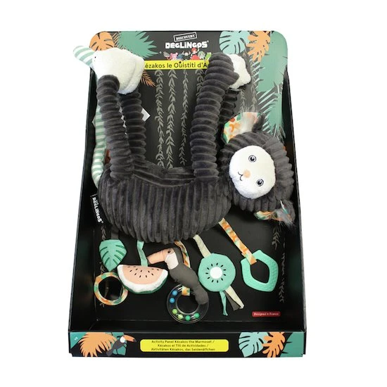 Un ouistiti plein d’activités d’éveil qu’on emmène et qu’on accroche partout grâce à ses pattes en veclro: à son lit, sa poussette ou même à son bras! Un vrai compagnon de jeu et de manipulation pour des découvertes toute en douceur! Comprend un miroir, un pouet-pouet, du papier bruissant, 2 anneaux de dentition et des pattes velcro.