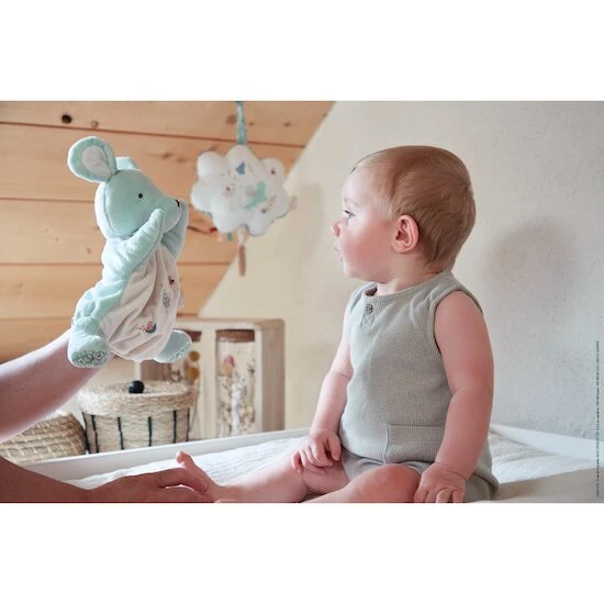 Le doudou marionnette Souris de 24cm de hauteur, est la représentation de la fameuse comptine « Une souris Verte ». Les broderies racontant l’histoire sont cousues sur le ventre tout doux de la souris. Animez la marionnette souris au son de de la comptine pour partager un moment avec bébé en lui jouant au jeu du « coucou-caché ». Vous pourrez ensuite lui donner le doudou à la fin de la comptine afin qu’il lui fasse de tendres câlins. L’association de la musique et la marionnette stimulent le langage, l’attention, la curiosité mais aussi le développement moteur des tout-petits. Lavable en machine.