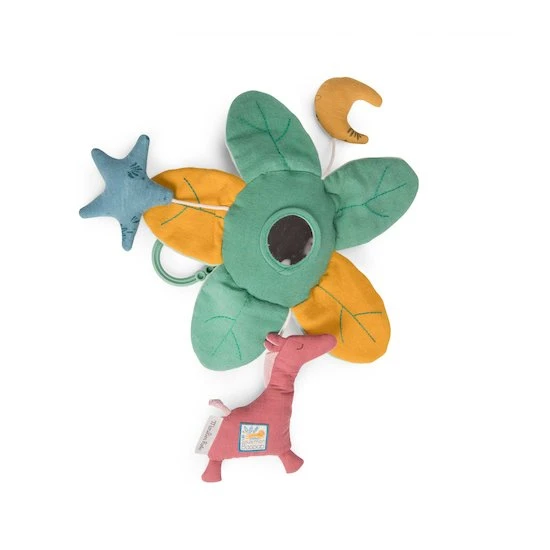 Suspension feuilles d’activités au jeu de couleurs, textures et motifs variés. Bébé va s’amuser avec les feuilles qui font scritch, l’étoile qui fait pouët. La lune et la girafe contiennent chacune un grelot. Il y a même un miroir pour y voir son reflet.