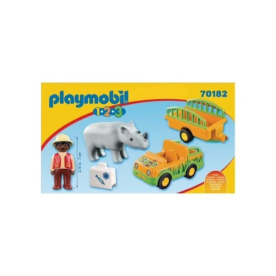 Avec Playmobil 1.2.3, le vétérinaire avec véhicule et rhinocéros, votre enfant imagine et crée ses premières histoires. Le vétérinaire, muni de sa petite valisette, prend soin du rhinocéros et le ramène dans son enclos avec son véhicule à remorque.
