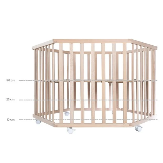 Parc hexagonal ‘roba Style’, bois naturel vernis, hauteur 72 cm, diamètre maximal 119 cm, réglage sur 3 hauteurs, fond et tour de parc rembourré lavable gris, 6 roulettes avec frein